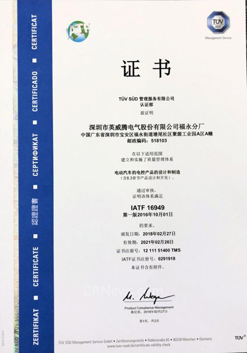 近日,深圳市英威騰電動汽車驅(qū)動技術(shù)有限公司順利通過IATF16949:2016標(biāo)準(zhǔn)換證審核。