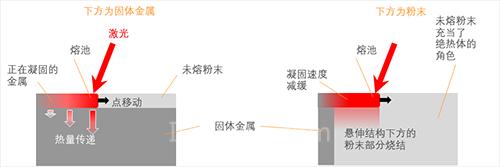 上圖 — 在固體金屬上方熔化粉末能夠快速冷卻(左)。當(dāng)粉末熔化過(guò)程發(fā)生在懸伸區(qū)域時(shí),由于其下方是未熔粉末,因此需要更長(zhǎng)時(shí)間冷卻,而多余的材料可能會(huì)附著在零件的底面。