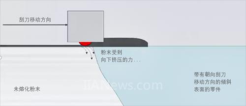 上圖 — 加粉刮刀和零件斜邊的相互作用。