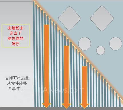 散熱通道 — 未熔粉末是一種絕熱體。支撐會(huì)從下表層區(qū)域轉(zhuǎn)移走一些熱量,這有助于避免粉末燃燒、過(guò)度熔化、變形和變色;對(duì)于正對(duì)刮刀方向的下表層,其效果尤為顯著。通過(guò)旋轉(zhuǎn)零件改變其與刮刀的相對(duì)朝向,也可減少上述不利影響。