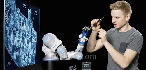在2017年的漢諾威工博會(huì)上, Festo 通過(guò) BionicCobot 展示了人類(lèi)如何與輕量化氣動(dòng)機(jī)器人進(jìn)行合作。今年,與未來(lái)概念展品一道,仿生學(xué)習(xí)網(wǎng)絡(luò)的工程師們將展示突破性的人機(jī)合作工作環(huán)境。他們?cè)鰪?qiáng)了BionicCobot 的各項(xiàng)能力:由于操作簡(jiǎn)單、采用了位置監(jiān)控以及將語(yǔ)音控制與機(jī)器學(xué)習(xí)和人工智能組合在一起,人和機(jī)器人才能直觀、高效率地進(jìn)行合作。