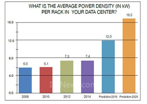 根據(jù)Colocation America調(diào)查,2008年數(shù)據(jù)中心單一機(jī)柜機(jī)架功率密度約莫在6kW左右,到了2016年已然達(dá)到了12kW,預(yù)估到了2020年,數(shù)據(jù)中心單一機(jī)柜機(jī)架功率密度將有可能達(dá)到16.5 kW。事實(shí)上,在某些改造案例中,例如Intel將兩座芯片廠改造成節(jié)能高密度數(shù)據(jù)中心,單一機(jī)柜機(jī)架功率密度更是高達(dá)43 kW。