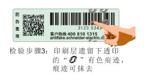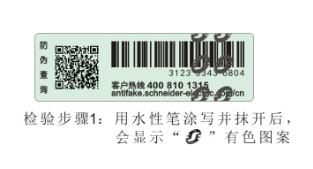 4. 物理自檢:步驟包括(1)用水性筆涂寫標(biāo)簽并抹開,標(biāo)簽會顯示施耐德電氣標(biāo)識的有色圖案;(2)揭開表面薄膜層,可見印刷層遺留下透印的施耐德電氣標(biāo)識的有色痕跡;(3)印刷層遺留下透印的施耐德電氣標(biāo)識有色痕跡可抹去。