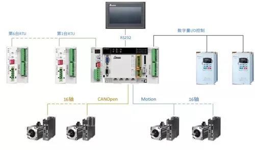 如圖所示,臺達多軸運動控制器DVP-15MC系列配置外部編碼器為主控制器,搭配人機界面DOP-B系列以及其他控制元件(RTU-DNET遠程DeviceNET模塊、 DeviceNet主站模塊等),可以監(jiān)控修改編碼器位置,在觸摸屏內(nèi)能夠存儲至少100種車型數(shù)據(jù),可以隨時調(diào)用;程序可以在線修改并下載,達到靈活運動控制。