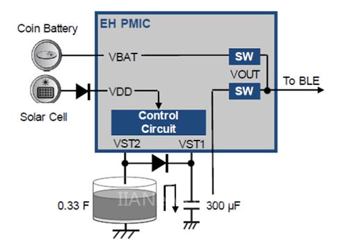 PMIC 轉(zhuǎn)換兩種能量來(lái)源,以便 WSN 可以在所有條件下(即使沒(méi)有燈光的情況)運(yùn)行。轉(zhuǎn)換自動(dòng)產(chǎn)生,使能源在有需要時(shí)供應(yīng)給 WSN 。因此,這應(yīng)該是 WSN 最適當(dāng)?shù)挠布O(shè)計(jì)。