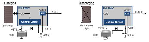 首先,PMIC儲(chǔ)存太陽(yáng)能到存儲(chǔ)設(shè)備 VSTORE1(VST1),此例中為一個(gè) 300-μF 的陶瓷電容器。當(dāng) VST 1 達(dá)到 VOUTH V,能量就可以傳輸?shù)?MCU 。但這個(gè)簡(jiǎn)單的能量收集設(shè)計(jì)不能全日運(yùn)作,原因是沒(méi)有備份電容器。讓我們來(lái)看看,備份電容器如何加配到 PMIC 設(shè)備,和電容器能夠如何支持 MCU。