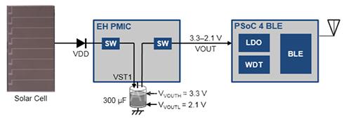 而電源管理芯片(PMIC)是用來(lái)穩(wěn)定能量收集設(shè)備所收集的能量,并需要支持其本身的超低功耗的運(yùn)行。打個(gè)比方,賽普拉斯S6AE103A PMIC 器件的電流消耗低至280 nA,啟動(dòng)功率為 1.2 uW(見(jiàn)圖3)。因此,在約100 lx的低亮度的環(huán)境中,依然可以從緊湊型太陽(yáng)能面板獲得少量的能量。