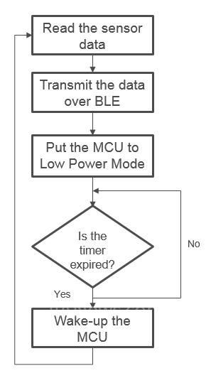 嵌入式 MCU 提供各種低功耗模式,以減少電流消耗。固件設(shè)計(jì)人員需要考慮這些低功耗模式和設(shè)計(jì)代碼,這樣,平均電流的消耗就能減至最低。例如,傳感數(shù)據(jù)并不是瞬速變更的,固件需要間中掃瞄傳感數(shù)據(jù)(例如每隔 5 至 10 秒鐘,時(shí)間間隔視乎傳感器而定)。傳感器的已讀數(shù)據(jù)通過(guò) BLE, 以無(wú)線方式傳輸。