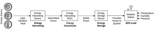圖 1 顯示了能量收集系統(tǒng)的框圖。能量是由能量收集系統(tǒng) (如太陽(yáng)能板)收集,并由電源管理集成電路(PMIC)轉(zhuǎn)換成穩(wěn)定的能量,再使用低漏、低阻抗的電容器儲(chǔ)存。這些能源能供給傳感器接口負(fù)載(譬如微控制器MCU),用來(lái)無(wú)線傳輸傳感器數(shù)據(jù)。本圖中,能量收集系統(tǒng)(EHS)是無(wú)線傳感器節(jié)點(diǎn)。