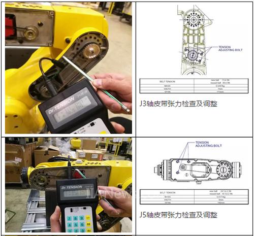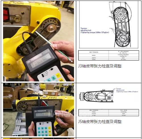 該系列機(jī)器人有三根皮帶(J3軸,J5軸,J6軸),皮帶隨著使用可能會(huì)出現(xiàn)磨損松動(dòng),所以保養(yǎng)時(shí)需要對(duì)該型號(hào)機(jī)器人的皮帶進(jìn)行張力檢查。