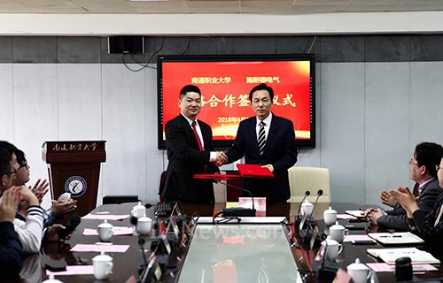 施耐德電氣工業(yè)事業(yè)部戰(zhàn)略和業(yè)務(wù)發(fā)展部經(jīng)理陳斌與南通職業(yè)大學(xué)校長(zhǎng)馬成榮代表雙方簽約