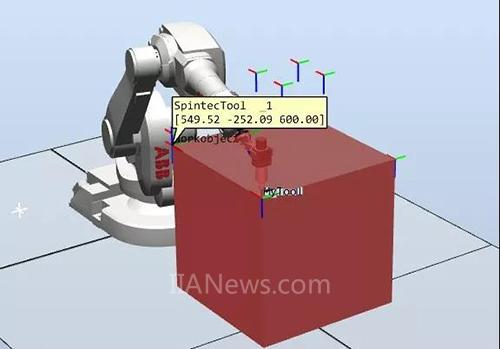 1)機(jī)器人做好軌跡后,可以通過碰撞檢測來檢查機(jī)器人工具是否和工件碰撞,如下圖,機(jī)器人工具在該位置與工件相撞