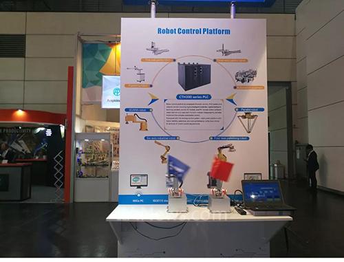 合信萌動機器人展臺,展示了機器人控制平臺:集PLC控制和網(wǎng)絡(luò)控制于一體,包含數(shù)字化智能主控制器CTH300 PLC搭配伺服驅(qū)動、數(shù)字化智能示教盒、遠程智能I/O模塊以及PC端遠程控制軟件MiCo。用戶既可以獨立使用各功能模塊,也可以集成實現(xiàn)各種復(fù)雜的自動化控制。此平臺系統(tǒng)不僅用于展臺的舵機機器人,也應(yīng)用于復(fù)雜協(xié)作機器人。