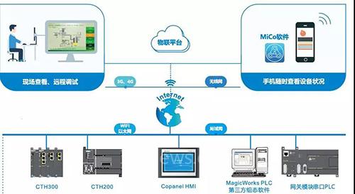 合信應(yīng)運工業(yè)4.0而生的以太網(wǎng)產(chǎn)品線包括:PLC(CTH200\CTH300)、網(wǎng)關(guān)模塊(CP6453)、Copanel HMI(TP系列\(zhòng)TP-i系列),這些不同設(shè)備組成的控制系統(tǒng),可支持WIFI/以太網(wǎng)、RS485通信,數(shù)據(jù)能通過3G\4G\局域網(wǎng)、無線網(wǎng)等方式接入Internet,從而實現(xiàn)對工業(yè)大數(shù)據(jù)的處理和應(yīng)用。