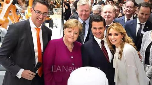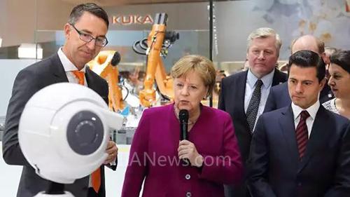 在博覽會(huì)上,庫(kù)卡CEO Till Reuter向德國(guó)總理默克爾和墨西哥總統(tǒng)恩里克培尼亞涅托展示新的消費(fèi)者機(jī)器人技術(shù)概念以及新型人機(jī)協(xié)作機(jī)器人LBR iisy。