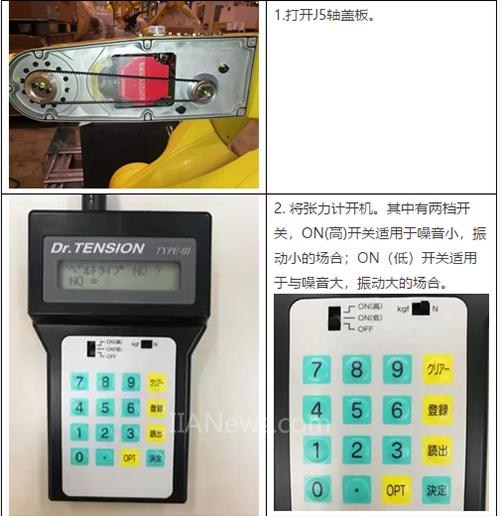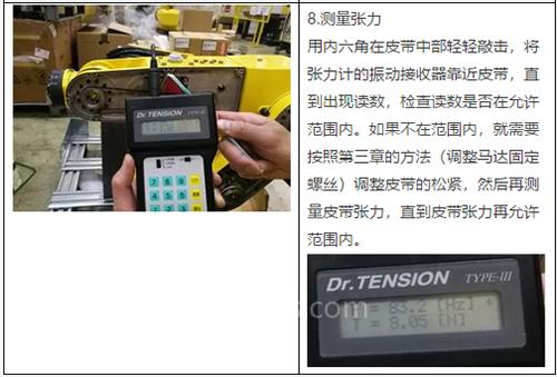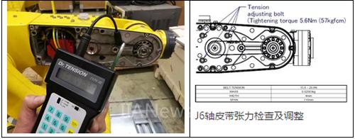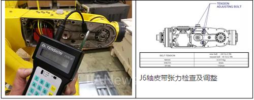 該系列機(jī)器人有三根皮帶(J3軸,J5軸,J6軸),皮帶隨著使用可能會(huì)出現(xiàn)磨損松動(dòng),所以保養(yǎng)時(shí)需要對(duì)該型號(hào)機(jī)器人的皮帶進(jìn)行張力檢查。