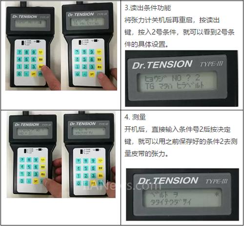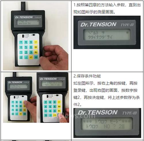 每一臺(tái)機(jī)器人有三根皮帶要測(cè)量,需要三組條件。一個(gè)一個(gè)輸入會(huì)比較繁瑣,這里使用張力計(jì)的測(cè)定條件的保存功能(最多10組條件,NO:1-10)。