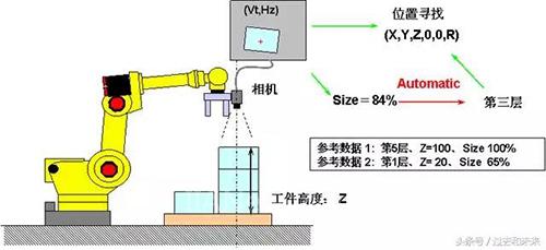 視覺(jué)堆垛程序通過(guò)相機(jī)視野內(nèi)目標(biāo)比例的變化來(lái)估算目標(biāo)的高度并引導(dǎo)機(jī)器人的運(yùn)動(dòng)補(bǔ)償目標(biāo)的偏移,不但包括X軸,Y軸和X-Y平面旋轉(zhuǎn)度R,也同時(shí)包括Z軸。