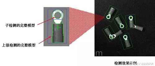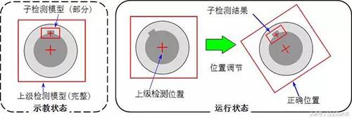 依據(jù)子檢測(cè)的結(jié)果,對(duì)應(yīng)目標(biāo)表面明顯特征(如孔,鍵槽)調(diào)整父檢測(cè)的定位位置,獲得更精確的偏移和旋轉(zhuǎn)數(shù)據(jù)。對(duì)不能以整個(gè)示教模型進(jìn)行方向性定位的應(yīng)用較有效。對(duì)一個(gè)上級(jí)檢測(cè),可以使用多個(gè)下級(jí)子檢測(cè)來(lái)分析目標(biāo)的多種局部特性。