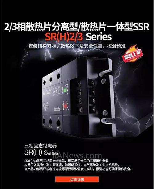 奧托尼克斯為您隆重推薦固態(tài)繼電器新陣容,實現(xiàn)緊湊化設(shè)計,靈活性安裝,易于維護(hù)。奧托尼克斯SSR包含單相及三相型號,散熱片可選擇分離型或一體型,另有超薄型,模擬量輸入型及插頭型等各種類別,為加熱器負(fù)載,半導(dǎo)體設(shè)備以及電機(jī)控制等各種應(yīng)用中提供持久可靠的性能支持。