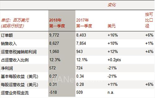 美元匯率的同比變化為訂單額帶來7%的增幅。2017年收購貝加萊與剝離相關(guān)業(yè)務(wù)帶來的業(yè)務(wù)組合變化相抵后,推動訂單額凈增長3%。第一季度的訂單出貨比為1.13,去年同期為1.07。