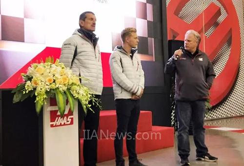 哈斯創(chuàng)始人Gene Haas(右1)車手Kevin Magnussen(中),領(lǐng)隊(duì)Romain Grosjean(左1)