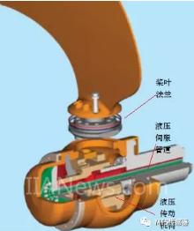 依靠液壓系統(tǒng)中的執(zhí)行元件變距油缸(Oil Distribution Box),高壓油通過中間空心油管(hydraulic pipe)驅(qū)動固定在槳轂里面的液壓傳動機(jī)構(gòu),進(jìn)而實現(xiàn)槳葉螺距變化的目的。