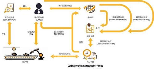與傳統(tǒng)的AGV控制系統(tǒng)算法(傳統(tǒng)的AGV廠家的控制系統(tǒng)無論AGV自身的控制器,還是上位調(diào)試算法,都是固定的)截然不同,博眾IGV調(diào)度系統(tǒng)采用以中間件為核心的網(wǎng)絡(luò)拓?fù)浣Y(jié)構(gòu):1. 客戶的MES、WMS系統(tǒng)可直接向中間件(或調(diào)度系統(tǒng))發(fā)送工作請求;2. 調(diào)度系統(tǒng)解析工作請求生成任務(wù)腳本并下發(fā)給IGV執(zhí)行,讓AGV真正的機(jī)器人化。