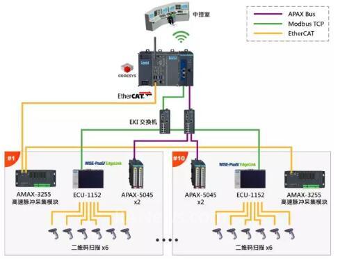 ● 需要分布式IO及串口采集方案,將各個子站中的IO數(shù)據(jù)及條形碼數(shù)據(jù)采集控制