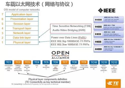 目前汽車以太網(wǎng)標(biāo)準(zhǔn)化方面存在多個(gè)組織,其既相互競賽,也多有合作,主要有:IEEE 802.1和802.3工作組,OPEN聯(lián)盟、AVnu聯(lián)盟以及汽車開放系統(tǒng)架構(gòu)聯(lián)盟AUTOSAR。TE也積極參與各個(gè)標(biāo)準(zhǔn)的制定工作,比如:在OPEN聯(lián)盟中,TE就是TC9工作組的主席,參與物理層標(biāo)準(zhǔn)的制定工作。
