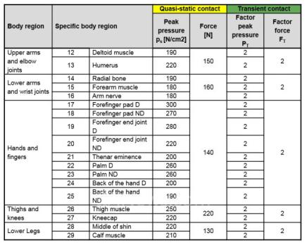 ISO/TS 15066基于生物力學(xué)的研究和測(cè)試結(jié)果,根據(jù)人體不同的部位,定義了準(zhǔn)靜態(tài)接觸和瞬態(tài)接觸的閾值,提供了機(jī)器人制造商與集成商,尤其是協(xié)作型機(jī)器人供應(yīng)商一個(gè)安全指導(dǎo)綱領(lǐng)。