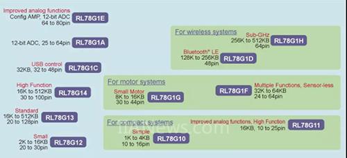 RL78/G1系列微控制器是基于瑞薩RL78 CPU內(nèi)核為核心構(gòu)建而成,該產(chǎn)品具有真正的低功耗特性和安全功能,除了常用的功能外設(shè)的系列之外,還添加了低功耗無線Sub-GHz的RL78/G1H和低功耗藍(lán)牙RL78/G1D產(chǎn)品,以及用于無傳感器無刷直流電機(jī)控制的RL78/G1F微控制器。下面將對這些產(chǎn)品系列的特性分別進(jìn)行闡述。