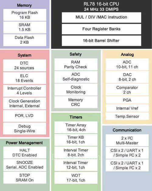 RL78 / G11微控制器系列產(chǎn)品具有10~25引腳小型封裝、小型16KB閃存和豐富的模擬外設(shè),如A / D轉(zhuǎn)換器、D / A轉(zhuǎn)換器、比較器和PGA,可配置為PGA + ADC + V BGR、PGA + CMP、CMP + DAC / V BGR或PGA + CMP + DAC / V BGR。通過使用DTC和ELC等智能功能,可以在內(nèi)部連接許多外圍設(shè)備,以減少CPU使用負(fù)荷量,并節(jié)省整體功耗。該系列還支持非常低的功耗(100uA @ 1 MHz)和高速4μs喚醒。RL78 / G11微控制器系列采用小型3x3mm2WFLGA、4x4mm2HWQFN和標(biāo)準(zhǔn)20引腳的LSSOP封裝,適用于傳感器應(yīng)用、照明、電源和許多小型家用電器。下面是微控制器的功能框圖。