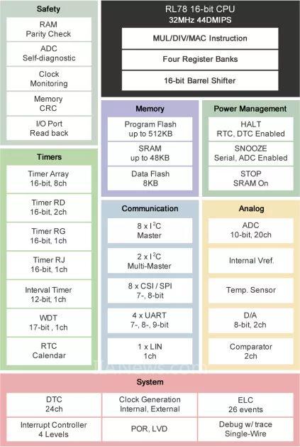 RL78 / G14微控制器系列是業(yè)界最低的消耗電流(CPU:66μA/ MHz,待機(jī)(STOP):240 nA)和44 DMIPS(32 MHz)的高計算性能的平衡產(chǎn)品。其內(nèi)置的多功能定時器,支持使用三相互補(bǔ)PWM輸出的三相電機(jī)控制。它們具有片上振蕩器、數(shù)據(jù)閃存、A / D和D / A轉(zhuǎn)換器、比較器等等。內(nèi)置安全功能(檢測硬件非法操作)支持家用電器安全標(biāo)準(zhǔn)(IEC / UL 60730)。憑借廣泛的30~100引腳陣容和高達(dá)512 KB的片上閃存,這些微控制器可用于多種應(yīng)用,如電機(jī)控制、消費(fèi)類和工業(yè)設(shè)備。下面是微控制器的功能框圖。
