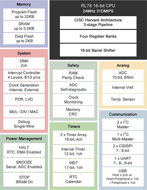 RL78 / G1C微控制器系列除了兩個全速USB 2.0主機(jī)通道外,還具有兼容電池充電規(guī)范BC 1.2,用于快速電池充電。這些微控制器適用于通過USB連接的辦公設(shè)備,如打印機(jī)、鼠標(biāo)和鍵盤,以及醫(yī)療設(shè)備的USB充電器、手機(jī)電池等。下面是微控制器的功能框圖。