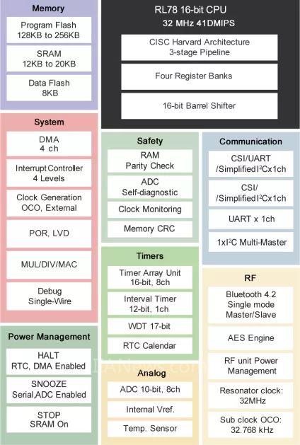 RL78 / G1D微控制器系列是用于智能連接的藍(lán)牙?低功耗微控制器。該產(chǎn)品具有4.3 mA的射頻發(fā)射電流(0 dBm輸出)和3.5 mA射頻接收電流,具有業(yè)界最低的電流消耗。由于內(nèi)置了連接天線所需的電路元件,因此不僅簡化了天線連接的電路設(shè)計,而且由于不需要外部元件,因此還有助于降低最終產(chǎn)品的成本。下面是微控制器的功能框圖。