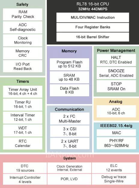 RL78 / G1H微控制器系列是業(yè)界功耗最低的Sub-GHz無線通信微控制器。該產(chǎn)品支持IEEE802.15.4e / g,具有業(yè)界最低的功耗,射頻接收在待機(jī)模式下為5.8 mA(3.3 V)。其巴倫電路和濾波電路使天線電路設(shè)計變得更簡單,并且可以減少外部元件以降低成本。它可以減少CPU負(fù)載,并且可以通過內(nèi)置的硬件功能輕松進(jìn)行開發(fā),適用于符合IEEE802.15.4e / g標(biāo)準(zhǔn)的產(chǎn)品,特別是Wi-SUN。另外還提供符合IEEE802.15.4e / g的收發(fā)器芯片RAA604S00,可與該微控制器結(jié)合使用。下面是微控制器功能框圖。