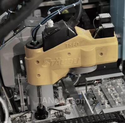 緩沖器位于史陶比爾RX160大負(fù)載六軸機(jī)器人的工作范圍之內(nèi)。RX160從緩沖器中拾取32個(gè)觸針。注塑機(jī)的裝卸操作必須在5.7秒內(nèi)完成,因此機(jī)器人也必須快速配合以實(shí)現(xiàn)最優(yōu)周期。為了達(dá)到該速度,史陶比爾RX160機(jī)器人必須滿足一系列復(fù)雜的要求。機(jī)器人必須同時(shí)保持高速度和精確度,當(dāng)裝載工具時(shí),必須將誤差控制在百分之幾毫米之內(nèi)。配合特殊的夾具設(shè)計(jì)技術(shù),史陶比爾RX160在各方面都滿足了用戶的期望。