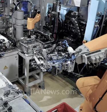 自動(dòng)化專家M.A.i公司設(shè)計(jì)了一套剎車燈開關(guān)生產(chǎn)系統(tǒng),核心設(shè)備為一臺(tái)高效注塑機(jī)和兩臺(tái)史陶比爾機(jī)器人,進(jìn)行對(duì)循環(huán)時(shí)間要求較高的操作。剎車燈開關(guān)插針是由八路機(jī)床進(jìn)行模塑生產(chǎn)的,每個(gè)開關(guān)含四個(gè)插針。開合模的時(shí)間只有短短5.7秒,所有的裝卸作業(yè)必須在這期間全部完成。