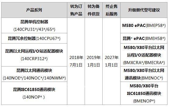● 從2018年7月1日起, 莫迪康 ePAC將全面替代昆騰控制器,升級換代時間詳見下表。作為新一代高性能控制器,莫迪康 ePAC包括面向單機控制應用的M580 ePAC、面向高可用性應用的專用硬冗余控制器昆騰+ ePAC和面向功能安全應用的M580 Safety ePAC。