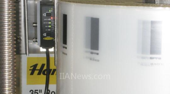 當(dāng)一片冰塊包裝材料行經(jīng)高速自動(dòng)包裝機(jī)時(shí),R58 Expert可以準(zhǔn)確檢測(cè)上面的色標(biāo)。