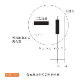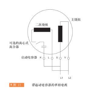下圖 (圖11) 給出了一個(gè)帶有永久連接電容器的單相電機(jī)。也可以采用其它設(shè)置,比如在達(dá)到指定速度以后打開相移回路。
