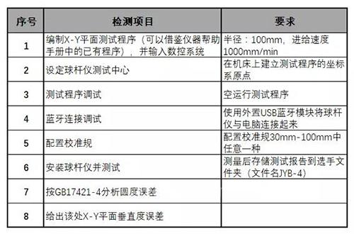 按照下表中第二列“檢測項目”和第三列“要求”,使用球桿儀對機器某指定位置按GB17421-4要求測量XY平面圓度(假定機器溫度20℃,膨脹系數(shù)11.7)。