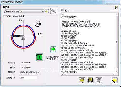 在測試期間,機床在XY平面上驅(qū)動球桿儀繞著中心固定組件做360°數(shù)據(jù)采集圓弧旋轉(zhuǎn)來采集數(shù)據(jù)。在數(shù)據(jù)被采集前后各有180°角度越程。此處首先是逆時針方向轉(zhuǎn)動,然后是順時針方向轉(zhuǎn)動。適合此測試的零件程序如下所示: