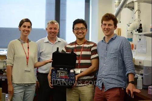 正在接收 Elmo 的演示站的“Matheson(左),Gaukroger(Elmo 英國公司)和其他機器人研究團隊成員(2017年6月)