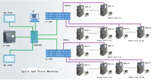 “瓦楞紙縱切機(jī)一般為多軸控制,刀數(shù)不同,用到伺服數(shù)量不同,如5刀8線需要21 臺(tái)伺服電機(jī)?!睏羁到忉屨f,西門子單臺(tái)PLC可帶V90的軸數(shù)從幾十根到上百根不等,一旦客戶需要調(diào)整機(jī)型,就硬件而言,只要通過增加和減少伺服的數(shù)量就可以實(shí)現(xiàn),而不需要額外增加硬件設(shè)備。