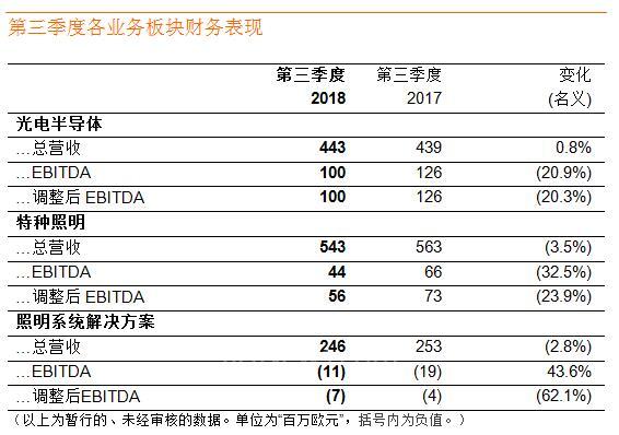 在2018財年第三季度,歐司朗在艱難的市場環(huán)境下保持業(yè)績穩(wěn)定。第三季度營收與上年同期持平,達(dá)10.2億歐元。特別項目調(diào)整后的息稅折舊及攤銷前利潤 (EBITDA)低于上年同期,為1.33億歐元。調(diào)整后EBITDA利潤率達(dá)13.1%。匯率變化,以及用于研發(fā)和提升產(chǎn)能的成本增加對第三季度的調(diào)整后EBITDA影響超過四千萬歐元。2018財年前三季度,這些影響因素累積超過1.3億歐元,其中7500萬歐元來自匯率影響。近來,受現(xiàn)有和即將實行的貿(mào)易限制等因素影響,全球范圍內(nèi)的客戶和經(jīng)銷商在購買行為方面出現(xiàn)變化,這也加重了集團(tuán)的營收壓力。綜合這些因素將對未來數(shù)月的公司運營產(chǎn)生影響,這也促使董事會在六月底調(diào)整了年度預(yù)期。在此背景下,董事會已作出決定在未來精簡產(chǎn)品線,第一步公司將出售燈具業(yè)務(wù)。