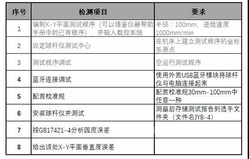 按照下表中第二列“檢測項(xiàng)目”和第三列“要求”,使用球桿儀對機(jī)器某指定位置按GB17421-4要求測量XY平面圓度(假定機(jī)器溫度20℃,膨脹系數(shù)11.7)。