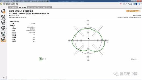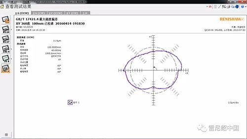 進(jìn)入分析數(shù)據(jù),在左側(cè)根據(jù)要求選擇“中國標(biāo)準(zhǔn)GB/T 17421.4” 進(jìn)行分析,并記錄“圓度偏差G”,注意:CCW和CW分別代表逆時(shí)針和順時(shí)針運(yùn)行,都需要記錄。如本例分別為:11.9μm(CCW)和11.5μm(CW)。