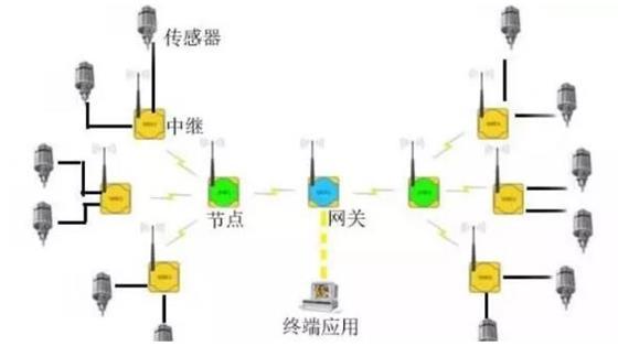 數(shù)據(jù)采集傳輸子系統(tǒng)由網(wǎng)關(guān)、節(jié)點(diǎn)、中繼、傳感器構(gòu)成。由下圖可以看出他們的作用與關(guān)系。